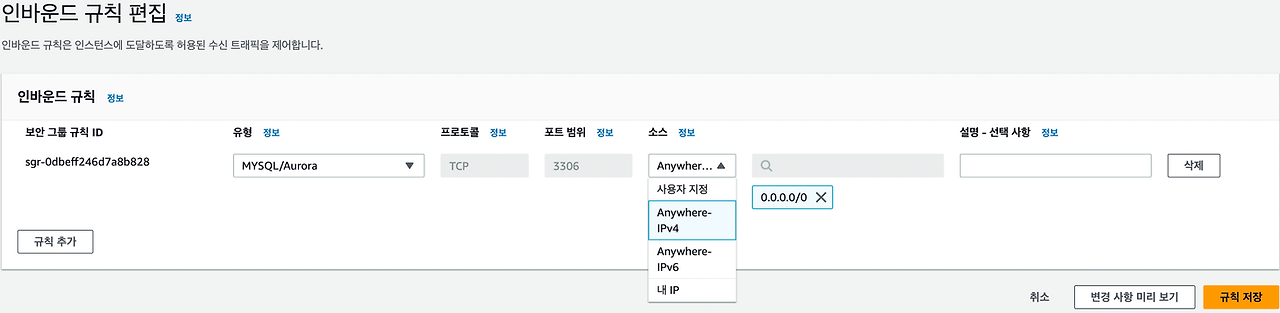 - 데이터베이스 -> VPC 보안그룹 -> 보안그룹 ID -> 인바운드 규칙 편집